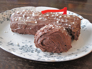 When the yule log was baked I dumped the cake out onto a clean kitchen towel and rolled it up and left it to cool. I made the icing (frosting to any American readers) - again chocolate, of course, and veeeery carefully unrolled the cake and iced it. The cake always cracks when I unroll it but that doesn't matter as you just shove icing over everything and that glues it together. When the top side is iced, you roll it back up and then cut off a few inches from one end, to form the branch.